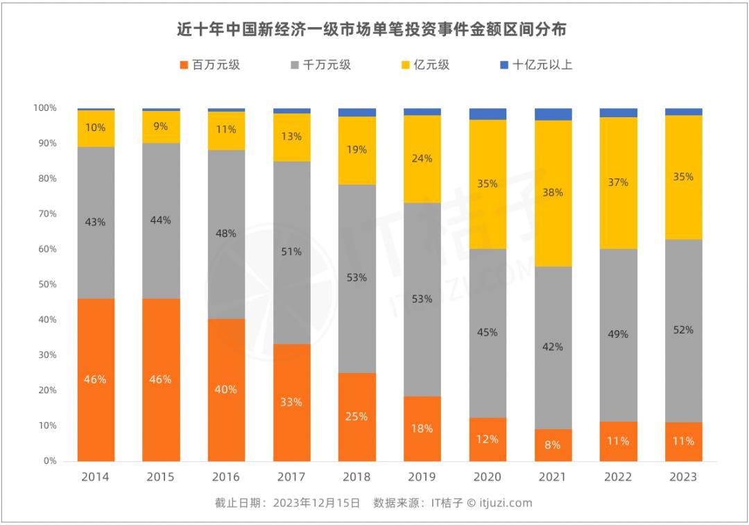 继续深入,会发现数据层面也能给到一些合理解释,那就是国内的融资结构也出现了重大变化,每年小金额的融资交易占比更小,而亿元级别甚至十亿元以上的占比变多了——