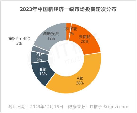 2023年国内发生的B轮、C轮融资事件有570、244起,同比各减少了26%、22%;D轮后的中后期融资事件仅有124起,同比减少28%,不过由于数量少,在总体中的占比为3%,这个数据几乎不变。