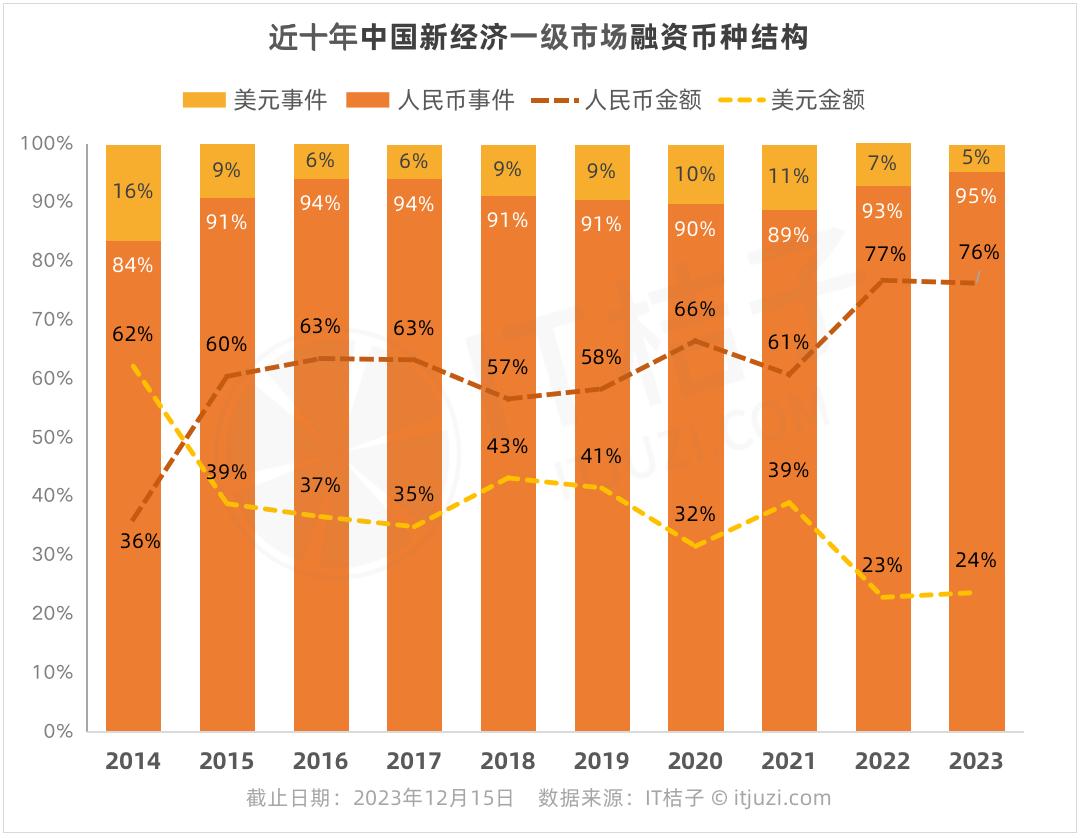 从交易总金额来看,国内人民币和美元融资交易有了明显的分化趋势:2014年,美元交易总金额领先于人民币;2015年后,人民币交易总金额占比在波动中攀升,2023年达到76%;而美元交易总金额占比波动下降到24%。