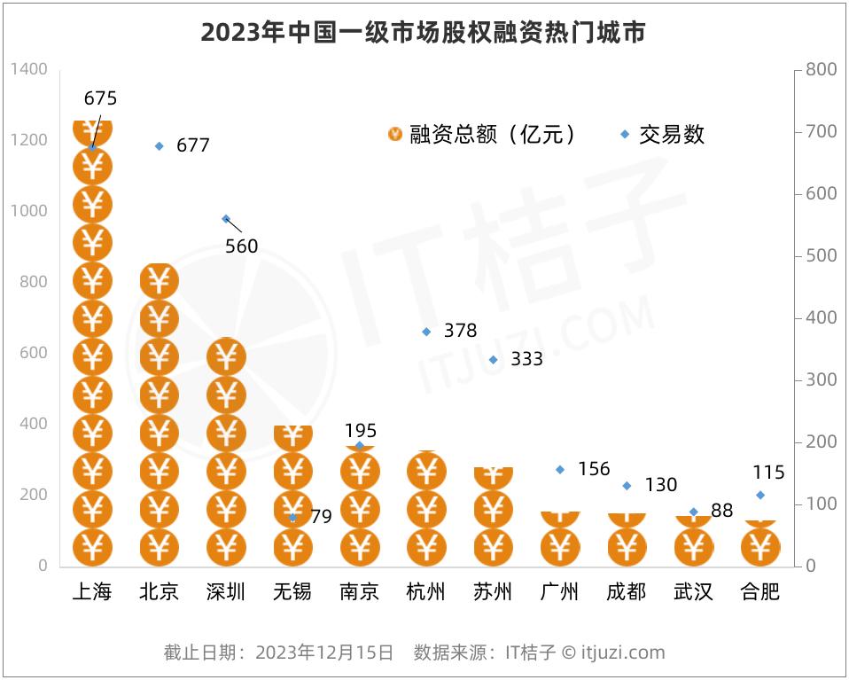 从城市排名来看,2023年国内融资最活跃(即投融资交易数量)的前十一个城市分别是北京、上海、深圳、杭州、苏州、南京、广州、成都、合肥、武汉、无锡。