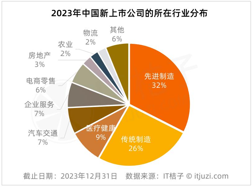 2023年,国内先进制造领域有126家企业实现IPO,在总体行业中占比32%;传统制造领域有100家企业实现IPO,占比26%;医疗健康领域有35家,占比为9%;汽车交通、企业服务领域各有27家、26家企业实现IPO,占比同为7%。另外,电商零售、房地产和农业、物流领域各有22家、10家、9家、9家新上市公司。