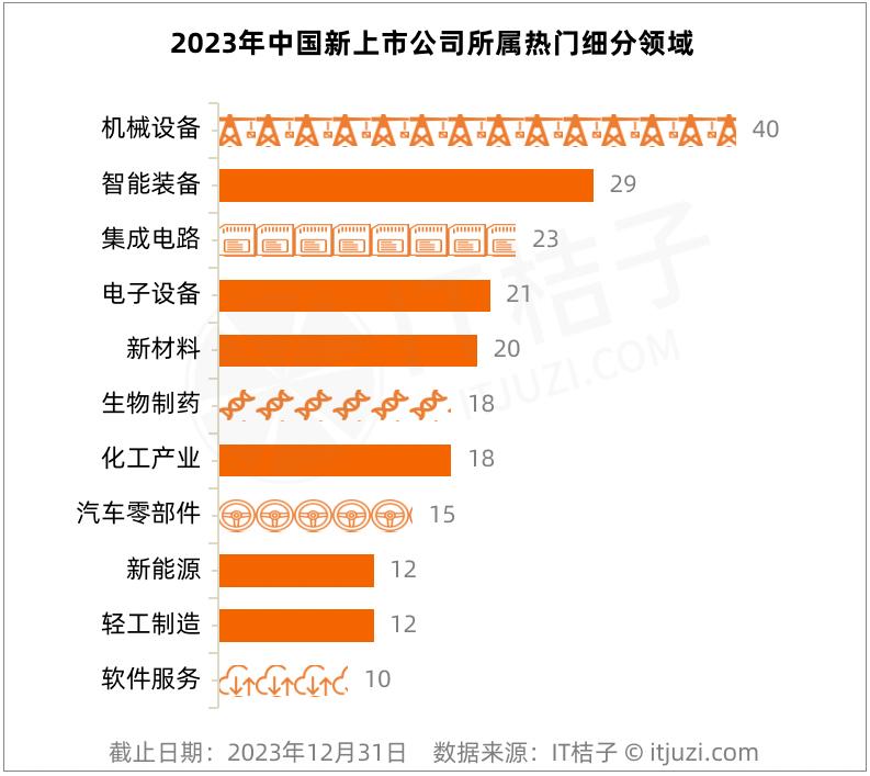 从细分领域来看,机械设备领域在2023年有40家新上市公司诞生,为各领域之最,有一半分布在浙江和江苏两地;智能装备、电子设备两个行业分别有29家、21家新上市公司,主要分布在广东、江苏和浙江。以及围绕汽车制造产业的汽车配套零部件也有15家公司成功上市,包括安徽的福赛科技、浙江的斯菱股份、湖北的开特股份等。