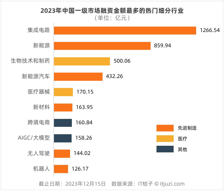 在投资交易上,集成电路、生物制药是本年度最热门的细分赛道,2023年内融资事件数分别有556起、402起;医疗器械、新能源领域的融资事件也超过了200起。